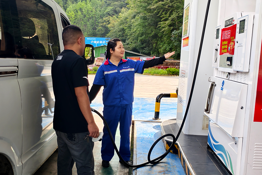 贴心提醒“不缺位”:员工见面先微笑问候,加油时不忘叮嘱安全。新手司机手忙脚乱,马上上前手把手教;外地车不熟悉山路,主动提醒“坡陡弯急,记得给轮胎冲降温水”,连路况细节都细细交代,就怕车主走弯路。